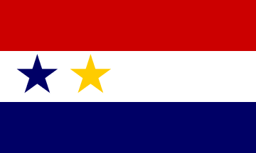 The basic design is an equal horizontal tricolor of red over white over blue, the latter being very dark, consistent with the national flag and its many derivatives [us.html], while the upper stripe shows a unusual and unexpected pale shade, nearing peach or salmon, in stark contrast with the deep red lettering nearby.
