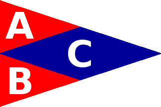 The burgee is depicted as a ca. 2:3 red burgee with a very dark blue fly diamond throughout, with a white capital centred in each of the panels, A over B before C.