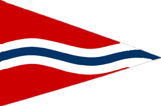 Burgee: Pennant circa 3:5 (web image). Orange field charged with a (1 unit wide) horizontal wavy strip of blue fimbriated white .