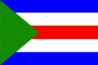 The flag of Liceo Faustino Harrison is horizontally divided blue-white-red-white-blue with a green triangle placed along the hoist.