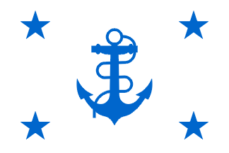 White flag with blue cabled anchor in the middle and three blue stars, one in top center and one in each lower corner.