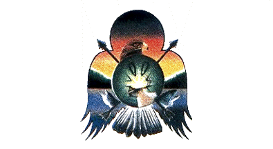 The flag is white with multicoloured winged device displaying a lake scene, overlain by an eagle and fish, in turn overlain by a disk showing a caribou and two arrows.