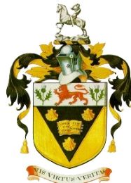 The excessive use of capital letters and a paucity of punctuation is characteristic of blazons from the College of Arms. It is also characteristic of the College to omit mention of the motto below the shield, which reads: Vis Virtus Veritas (Strength, Courage, Truth).