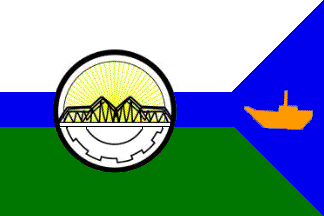The flag is horizontally divided white-green by a blue horizontal stripe ending in a blue triangle placed along the fly, charged with a yellow boat. In the middle of the flag is placed a white disk fimbriated black, charged with an iron bridge surrounded at the top by a half yellow sun and at the bottom by a gear wheel.