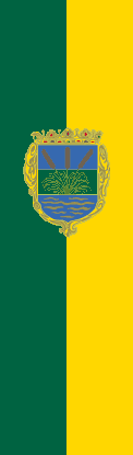 The flag is a vertical bicolor of green and yellow with the city coat of arms on it.