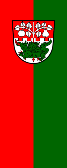 Description of arms (German): Ein von Rot und Silber erhöht im Zinnenschnitt geteilter Schild, pfahlweise belegt mit einer abgeledigten farbverwechselten Lanze, aus deren Schaft am Schnitt silbern aus wärts zwei bogenförmig belaubte Zweige, der vordere mit einem Apfel, der hintere mit einer Birne in das obere Feld wachsen, und die im unteren Feld einen grünen Drachen mit roter Flammenzunge und roten Waffen durchbohrt. [1]