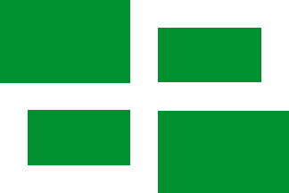The flag of Mettet is quartered by a white cross green and green with a white border.