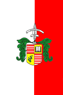 A vertical flag, vertically divided white and red, bearing the municipal arms in the centre.