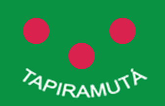 A green flag, three red disks 2 + 1, the name Tapiramutá in white in an arc below.