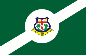 A dark green flag, with a white bend sinister, and the municipal shield centred on a white disk.