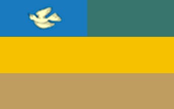 A horizontal tricolour, the upper stripe divided vertically blue and green, the other stripes yellow and brown. In blue field a flying white dove.