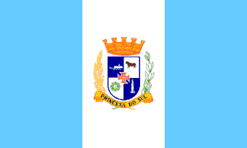 The flag is a vertical triband, light blue-white-light blue, with the coat of arms on the center. The coat of arms was designed by Artur Henrique Foerstnow and adopted in commemoration of the 150th anniversary of Pelotas on 24 October 1961. The field is divided quarterly, (1) blue with an Indian rowing a hide-covered boat called a pelota, from which the city takes its name, in white; (2) white with a black bullock, recalling the beef drying industry with which Pelotas originated; (3) white with a green rose, the symbol of the charity of the patron of the municipality, St. Francis de Paul, inscribed with the letters S, F, D, P, C; (4) blue with a white obelisk, the monument erected during the monarchy by republican idealists, which was the initial landmark for the settlement of the city. Overall on the center is a red and white cross of the Order of Christ (inaccurately described in the source as a "cross of Malta") in homage to the Portuguese explorers. The shield is flanked by branches of golden rice (the major source of agricultural income for the region) and green laurel (in recognition of the anniversary of the city). The shield is ensigned with a gold mural crown with five towers showing. The scroll is inscribed Princesa do Sul (Princess of the South).