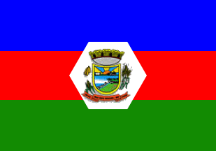 The flag of Rio dos Índios is horizontally divided blue-red-green, charged in the center with a white hexagone featuring the municipal coat of arms.