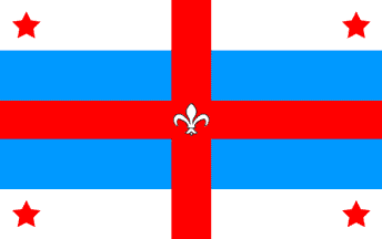 "The red cross represents the Anglophone culture in the north, south, east and west Quebec. The central fleur-de-lys represents Quebec. The four red stars are the Anglo-Quebec people in all four corners of the province. The blue symbolizes the many waterways of Quebec."