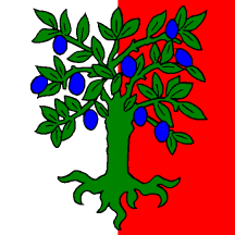 Per pale Argent and Gules, overall a Plum-tree eradicated Vert fructed Azure.