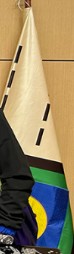 The flag was designed by local leader Jaime Alberto Beltrán Salamanca (probably by 2019), being created through a contest created through Contract 249 of that year. It was adopted officially through Local Agreement 003 of 2023 on 21 June 2023. With symbolism explained by its author: The flag itself is a beige field for local tranquility, peace, and harmony, with three brown diagonal dotted lines to the top-left and lower-right for thoughts leaving and entering by word, work, and action. In the center is a diamond shape outlined in brown for the great expanse of Mother Earth which allows for the building of the locality; it is also outlined in green for its parks and hills, connecting the city to rural areas, and agricultural production; and finally, going to the center is a blue diamond for having great importance in local waterways, where waterways connect and serve as a gateway to the Sumapaz Region. In the very center is a yellow circle with its color standing for happiness, love, and maintaining local culture.