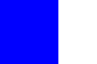 The Coat of Arms is blue, a yellow inescutcheon with three antlers, placed 2,1,