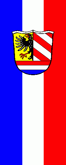 It is a blue-white-red vertical tricolour. The coat of arms is either shifted to the top (see left image above) or in a white bannerhead (see right image above).