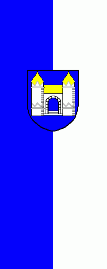It is a blue-white vertical bicolour. The coat of arms is shifted to the top.