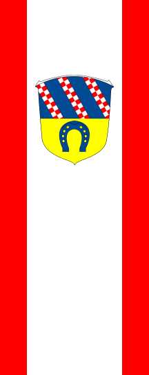 It is a red-white-red vertical triband with ratio of stripes approx. 1:4:1. The coat of arms is shifted to the top within the central stripe.