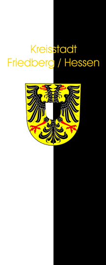 It is a white-black vertical bicolour. The coat of arms is shifted to the top. The shield is topped bya yellow unserifed inscription "Kreisstadt"(1st line) "Friedberg /Hessen"(2nd line).