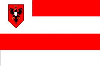 On 4 March 1833 the Trading Commission reported to the Senate that the State was lacking a law about the flag and proposed a white over red flag with the coat of arms in the canton. The Senate decided the next day (5 March) to choose a flag with four stripes red-white-red-white with the coat of arms in the canton. This flag was used until 1937 by the town motor boats. Proportions 2:3. The coat of arms has been, from the 15th century, "gules, an eagle argent, tongued and armed azure, beaked and crowned or". [Editor's note: the above blazon does not match the coat of arms in this page's flag images.]
