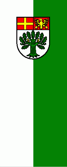 The banner is vertically divided into green and white with the coat of arms in the centre of the banner.