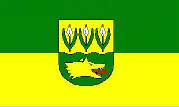 It is a green-white-green vertical triband with ratio of stripes 3:4:3. The coat of arms is in the middle of the white stripe.