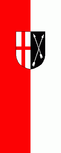 The gyronny shield displays the family arms of the Waldbott kin, former local rulers. The orb is referring to a fact that Bassenheim belonged to a Free Imperial Estate. Flag and banner are gyronny of 12 and the shield has shrunk to a little inescutcheon.