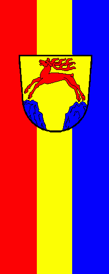 It is a red-yellow-blue vertical tricolour. The coat of arms is shifted to the top.