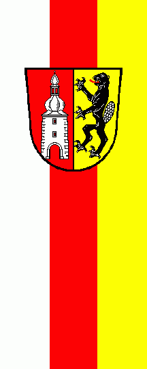 It is a white-red-yellow vertical tricolour. The coat of arms is shifted towards the top.