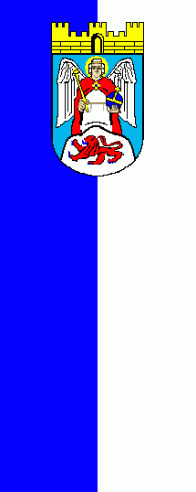 It is a blue - white vertical bicolour. The coat of arms is at the top.
