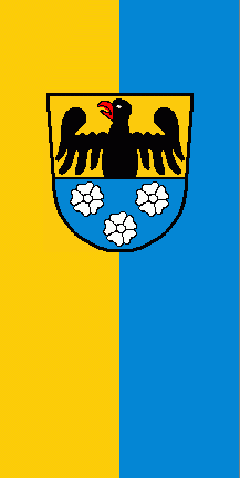 The ratio is approx. 2:1. It is a golden - celestial blue vertical bicolour. The coat of arms, version 1952, is shifted to the top.