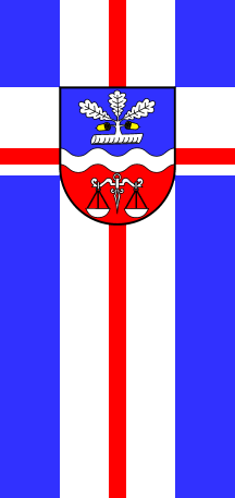 It is a blue-white vertical bicolour with centred coat of arms with a broad white fimbriation.