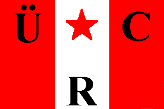 It is a vertical red-white-red-triband. At the top-edge of the red stripes are black capital letters "Ü" (hoist) and "C" (fly). In the white stripe there are a red 5-point-star at the top edge and a black capital letter "R" at the bottom edge.