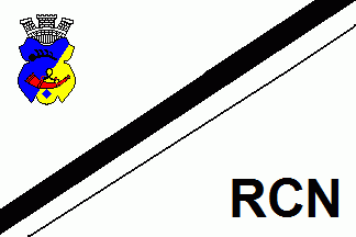 The white flag is divided per bend sinister by a black over white stripe. In the lower fly corner is a black inscription "RCN"". In the upper hoist quarter is a coat of arms topped by a white mural crown. The shield is divided per bend sinister into blue and yellow. It contains all the elements from the local coat of arms as follows: a black antler, a red horn with a blue diamond.