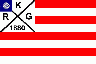 It is a horizontal 8-stripes flag with alternating red and white stripes starting with a red one. The canton is a white square divided by a black saltire with black capital letters "K"(hoist), "KR"(top), "G"(fly) and "1880" (bottom). Within the canton is a second canton showing a white shell in a dark blue field.