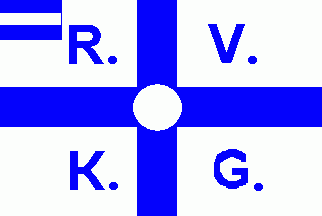 The white flag was parted by a blue centred cross with white disc on its centre. The quarters were charged with blue dotted initials on any corner as follows: "R."(upper hoist), "V."(upper fly), "K."(lower hoist) and "G."(lower fly). In canton was blue-white-blue horizontal triband.