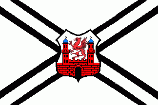 The white flag was parted by white saltire with broad black fimbriation, on centre were the borough arms of Altdamm.