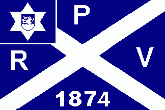 The flag was dark blue parted by a white saltire with white inscriptions on every quarter as follows: "P"(top), "R"(hoist), "V"(fly) and "1874"(bottom). The canton is dark blue separated by white lines containing the arms of on a white 6-point star. The arms display a beaver issuant from waves with a key in his mouth.