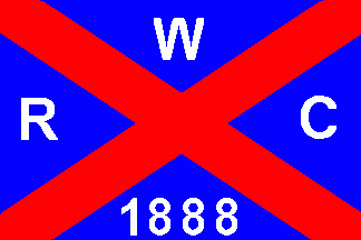 The flag was blue parted by a red saltire with white inscriptions on every quarter as follows: "W"(top), "R"(hoist), "C"(fly) and "1888"(bottom).