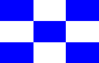 It is a white flag with a green and blue angle pointing to the hoist (see left image above), a variant (see left image above) displays the angle flanked by black capitals "A" and "S".