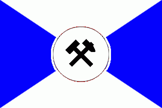 The company was located in Mülheim/Ruhr. The flag is divided by saltire into blue and white with a white disc cotized black and white in its centre, the disc containing in black hammer and mallet, the symbols of mining.