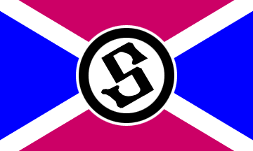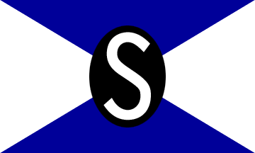 The flag is quartered per saltire, black in the top quarter, white in the bottom one and red in the other two. The white base quarter has a black sans serifed capital "S" (see left image above) or a red, serifed initial "S" (see right image above) in centre.