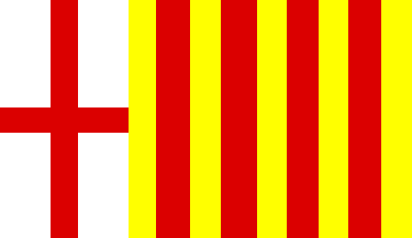 Yellow with four vertical red stripes (a banner of the Catalan-Aragonese arms), on a white hoist stripe a red cross.