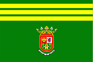 The flag of Gáldar is in proportions 2:3, green with three yellow stripes of equal width in the upper third and the municipal coat of arms in the bottom.