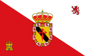 Description: Rectangular flag divided diagonally into two triangles. The upper triangle, at the fly, is white with a red lion at the top. The lower triangle, at the hoist, is red with a yellow castle at the bottom. The local coat of arms is in the center of the flag. The author is Luis González.