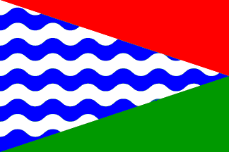 Flag: Rectangular flag, with proportions 2:3, with a triangle with a vertex at the fly midpoint and a base along the hoist, charged with ten wavy horizontal stripes in turn white and blue, the upper triangle at fly red and the lower triangle green.