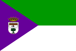 Flag: Rectangular, in proportions 3:2 (length to width), grafted at hoist. A purple equilateral triangle with the base along the hoist, the rest of the flag divided into two parts shaped like symmetrical trapezoids, the upper, green, and the lower, white. On the center of the triangle, the municipal coat of arms.