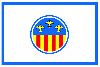 The coat of arms is made of a round shield, bordered in white and blue, "Per pale, 1. Azure three fleur-de-lis or 1+2 (France), 2. Or four pallets gules (Aragón).